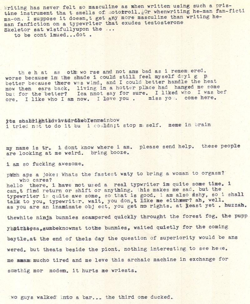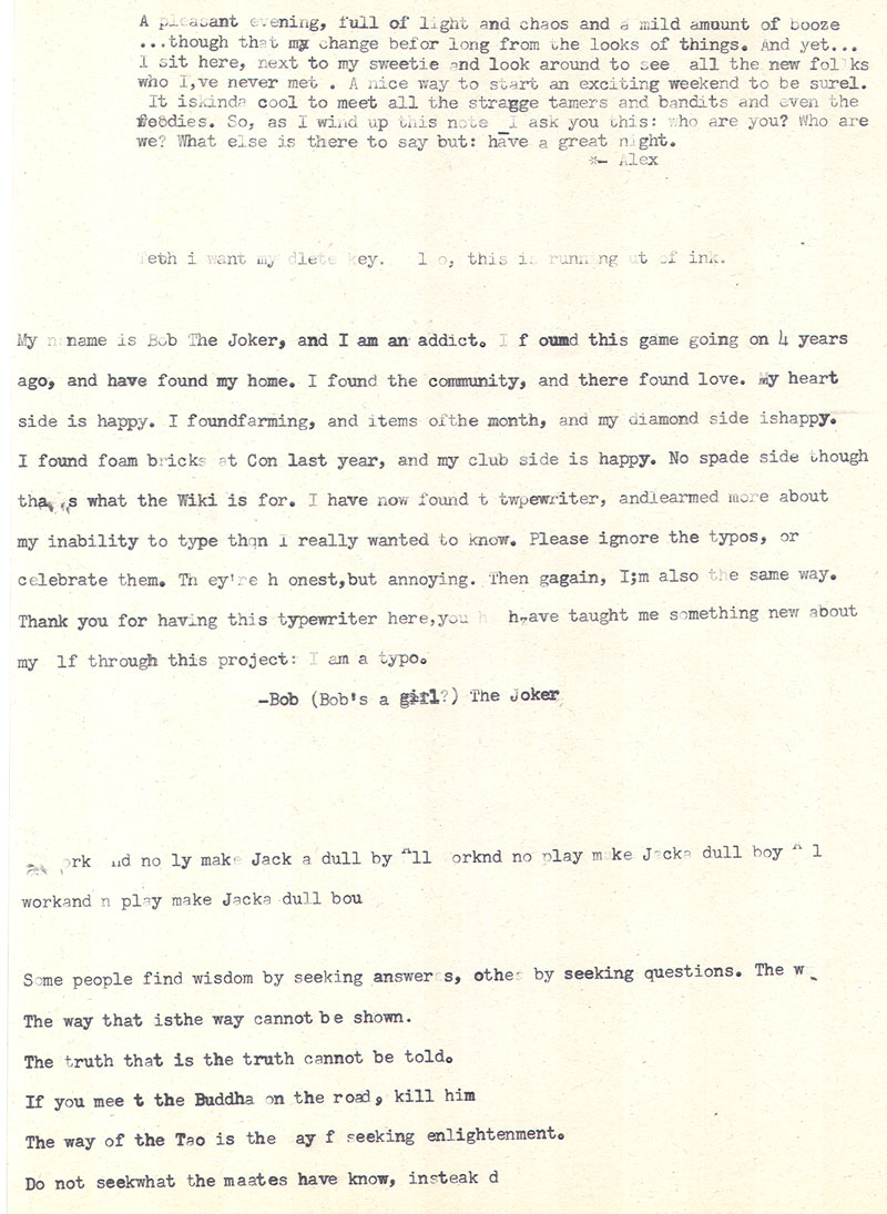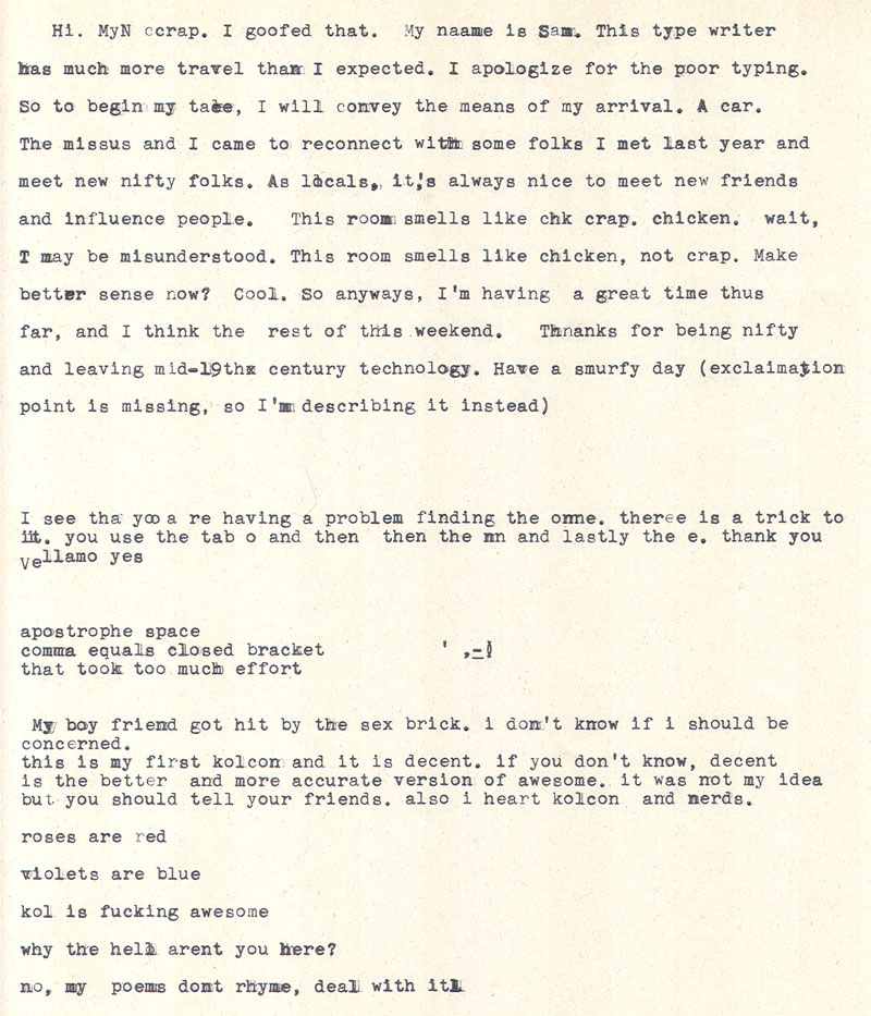 Date: September 17, 2010 Location #1: Dave & Buster's - Official First Event Location #2: Undisclosed Location, private clan party Weapon of Choice: 1947 Royal Quiet De Luxe Weapon of Choice: 1956 Smith-Corona Skyriter
